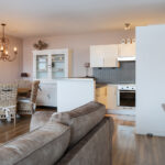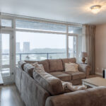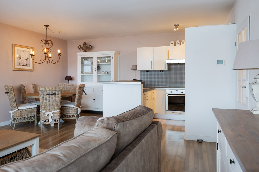 Woonkamer met grote raampartij waardoor veel natuurlijke lichtinval word gecreëerd. De wanden zijn voorzien van glad stucwerk en het plafond is eveneens voorzien van glad stucwerk. Op de vloer ligt een lichte laminaat (2017) volledig doorgelegd in het gehele appartement m.u.v. badkamer en toilet.