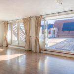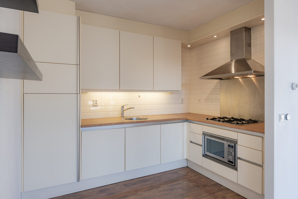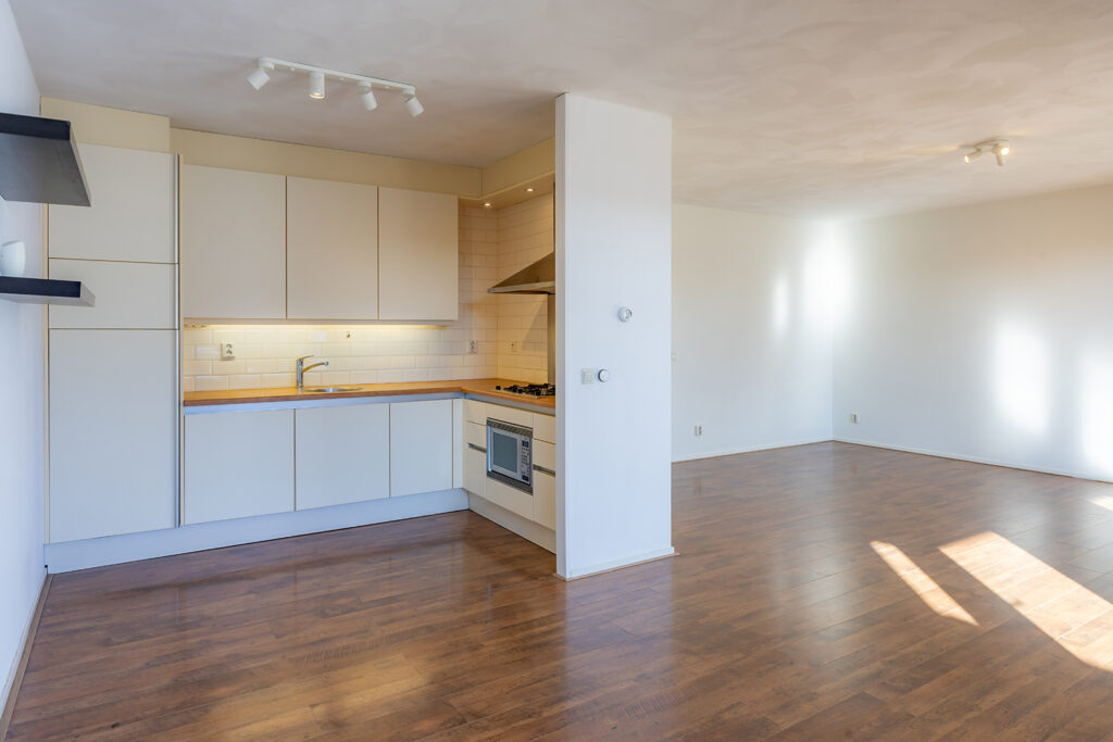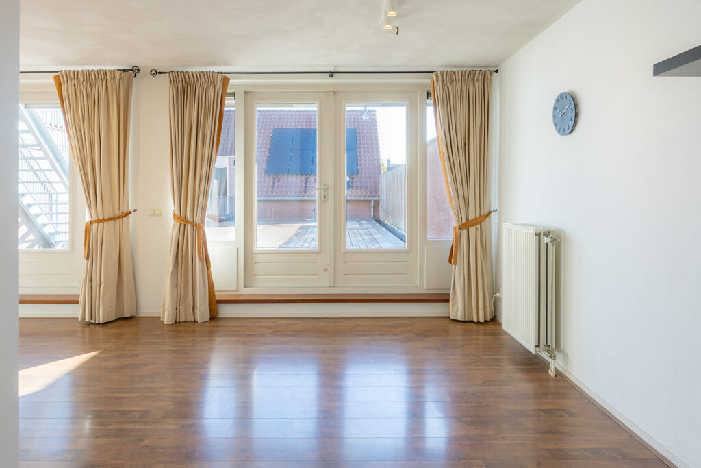 De woonkamer is ruim van opzet en gelegen aan de achterzijde van het appartement en voorzien van 2 dubbele openslaande tuindeuren welke toegang geven tot het riante unieke dakterras. De wanden zijn voorzien van spuitwerk en het plafond is voorzien van stucwerk. Door de grote raampartijen is veel natuurlijke lichtinval aanwezig.