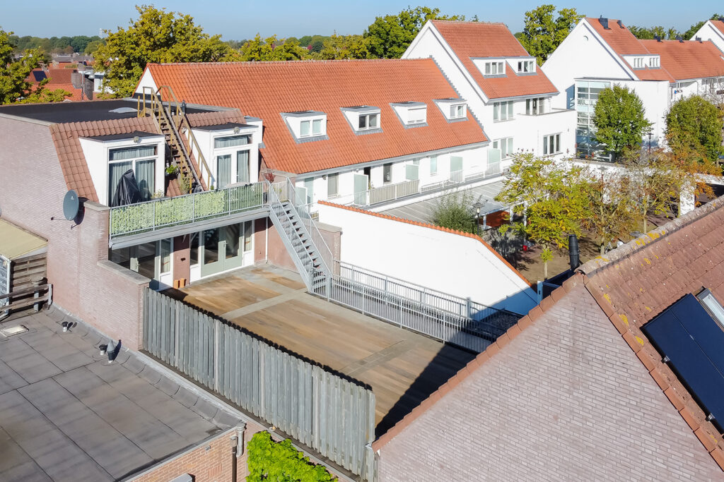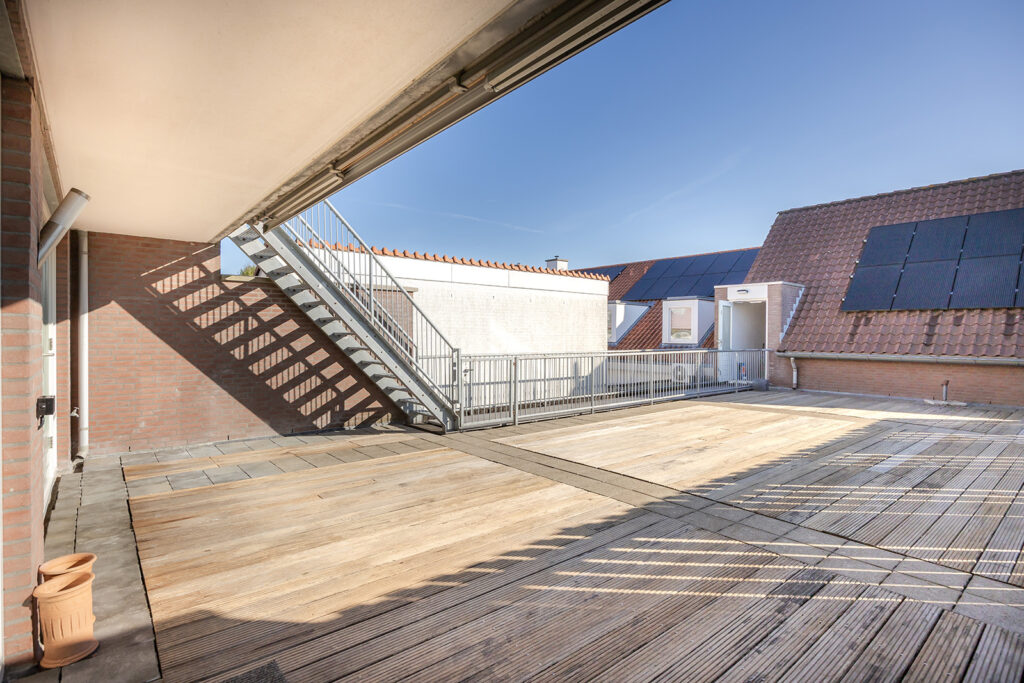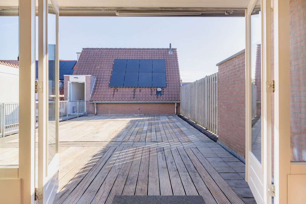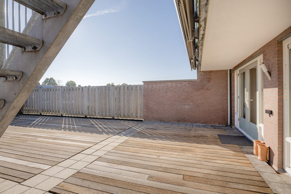 Het appartement beschikt over een prachtig riant deels bestraat en deels bevlonderd (dak)terras van maar liefst 87 m2. Het terras is toegankelijk vanuit de woonkamer en deels overdekt en de overkapping wordt nog verlengd met een elektrisch bedienbare zonneluifel over nagenoeg de gehele breedte van het terras. Het terras is gelegen op het zuidoosten en de mogelijkheid is aanwezig voor het plaatsen van een houten tuinhuis of een overkapping aan de achterzijde zodat. Er is gedurende de dag zon en schaduw te vinden.
