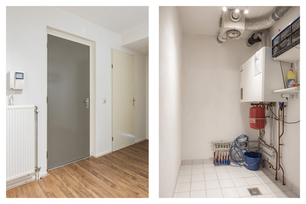 Via de hal is een inpandige praktische berging c.q. bijkeuken, met aansluitingen voor wasmachine en droger en plaats voor een (2e) koelkast en/of diepvries. Tevens bevindt zich in deze ruimte de combiketel van Nefit (bouwjaar 1999 en jaarlijks onderhouden geweest).