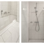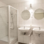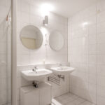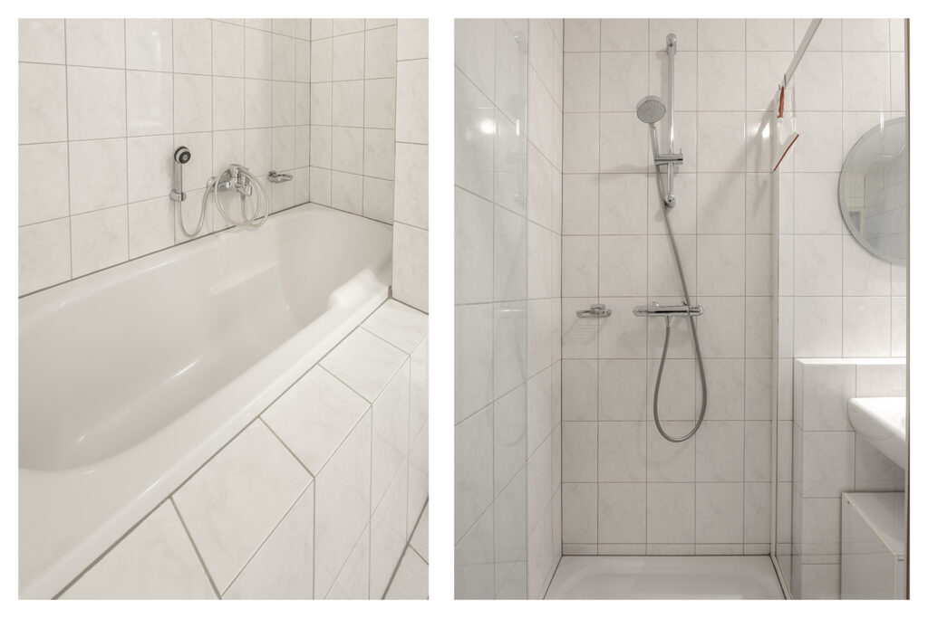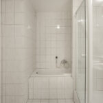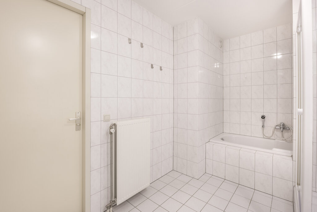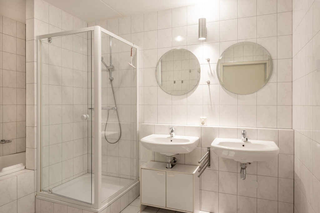 De volledig betegelde, zeer ruime badkamer is uitgevoerd met een ligbad, douchecabine en dubbele wastafel. Lichte kleuren sanitair en tegelwerk.