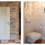Betegelde toiletruimte met inbouwcloset en fonteintje. Lichte kleuren sanitair en tegelwerk.