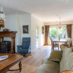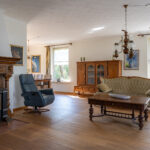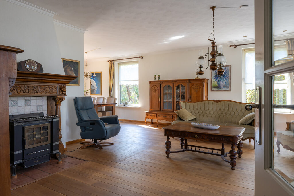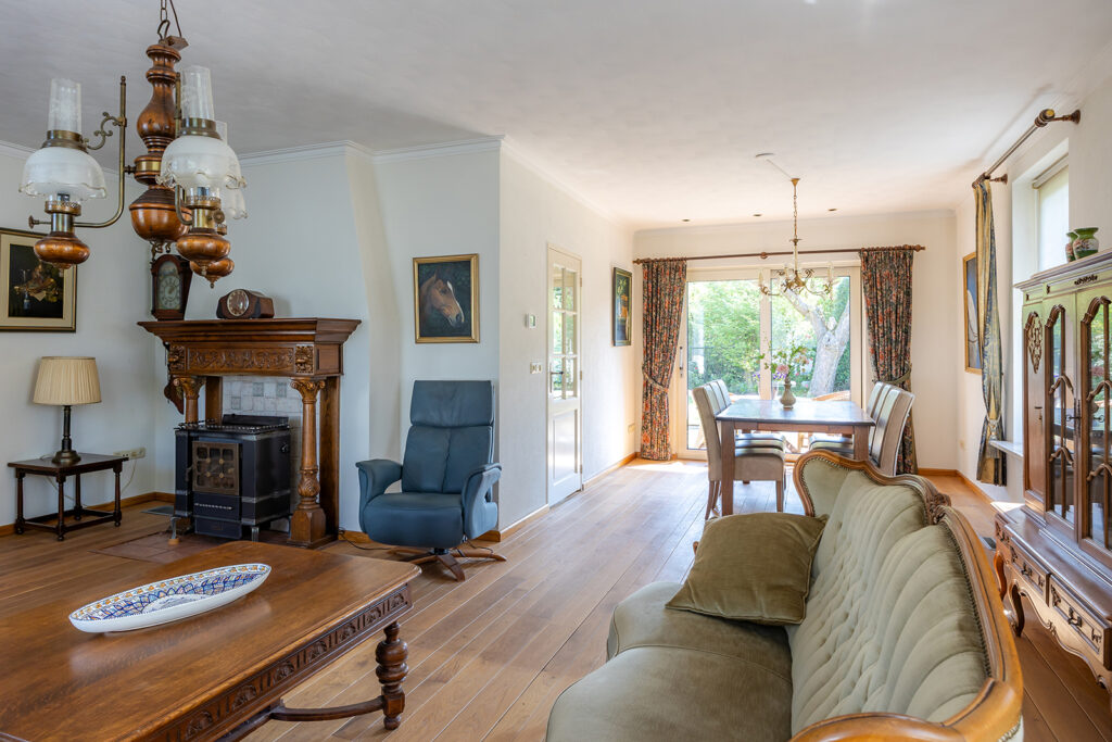 Aan de rechterzijde direct toegang tot de woonkamer. Ruime L- vormige woonkamer met eiken houten planken vloer, spachtelputz wanden en stucwerk plafond. De woonkamer is voorzien van een houtkachel. De achtergevel is uitgevoerd met een schuifpui welke direct toegang geeft tot het terras en de achtertuin.