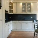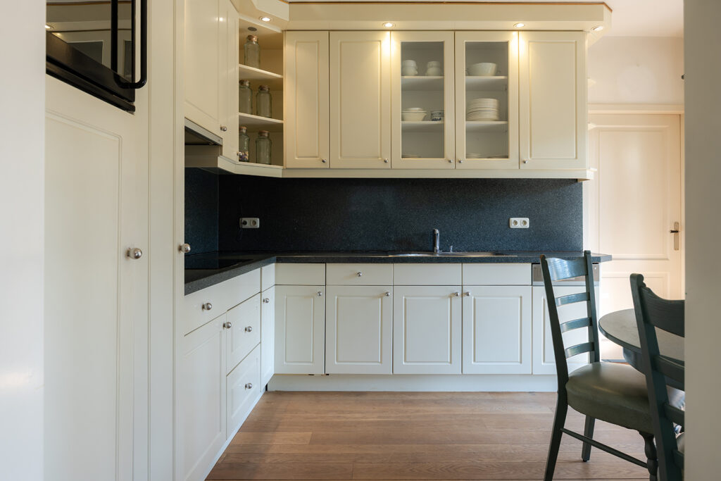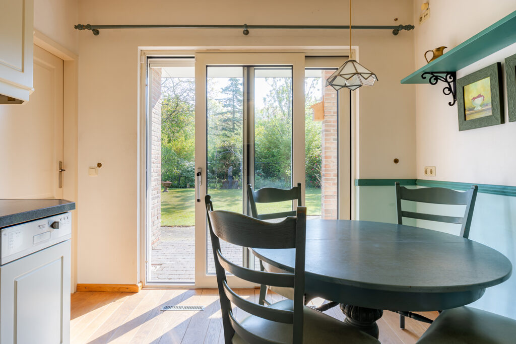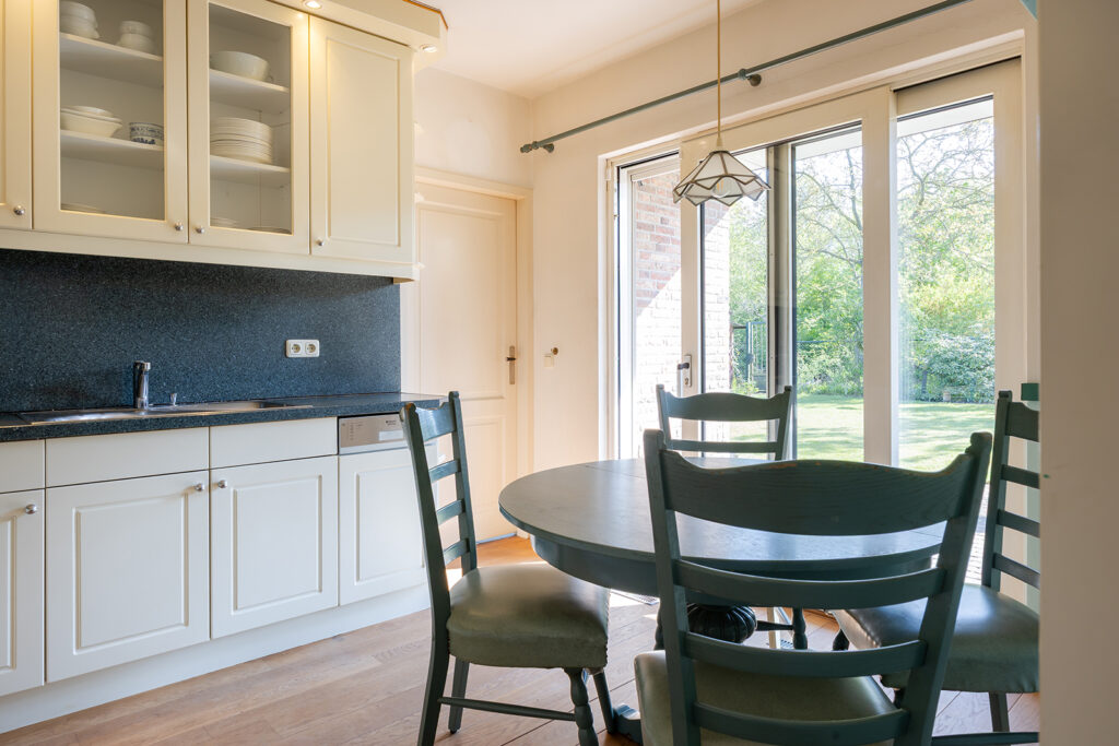 De gesloten keuken is bereikbaar via de woonkamer.  Vanuit de keuken is er een schuifpui die direct toegang geeft tot de achtertuin. De L-vorm keukeninrichting is voorzien van ruim voldoende kastruimte met een donker groen granieten werkblad en diverse apparatuur zoals: inductie kookplaat, afzuigkap, oven, vaatwasser en koelkast.