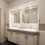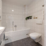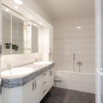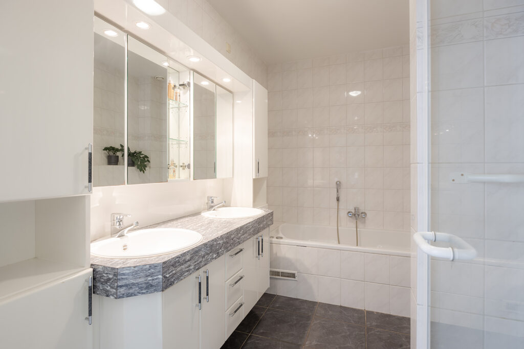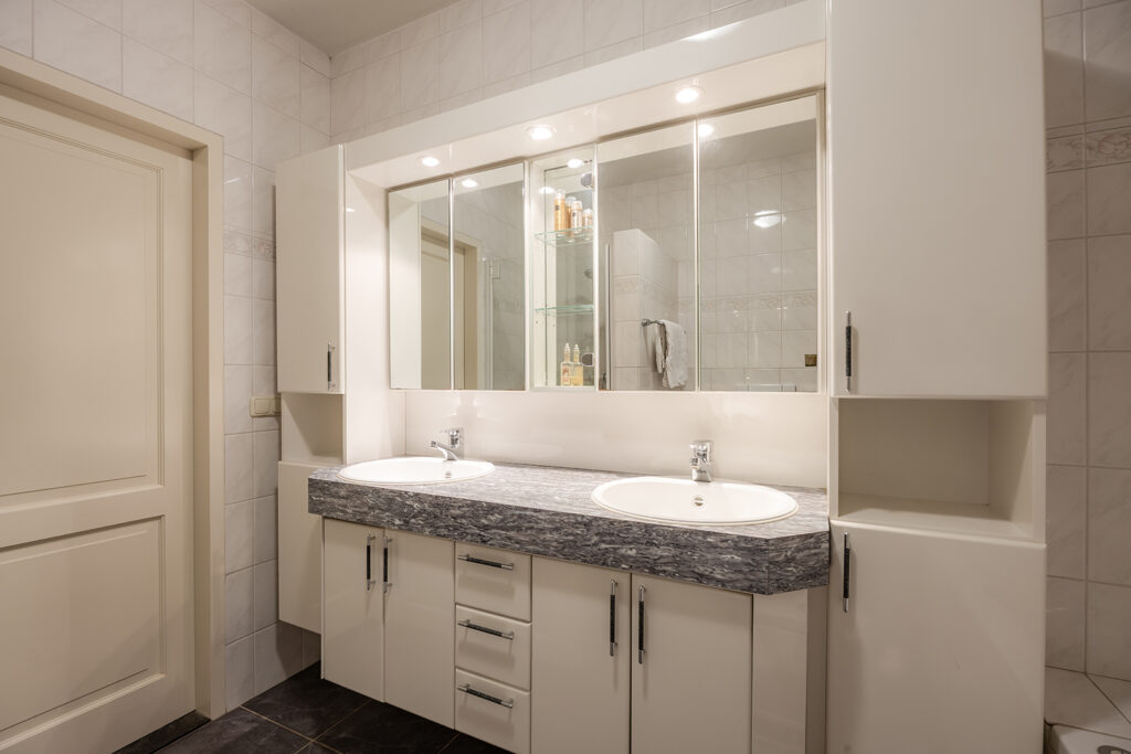 De volledig betegelde badkamer is voorzien van een ligbad, douche, een 2e toilet en dubbele wastafel met badmeubel. Sanitair en tegelwerk in lichte kleuren.