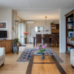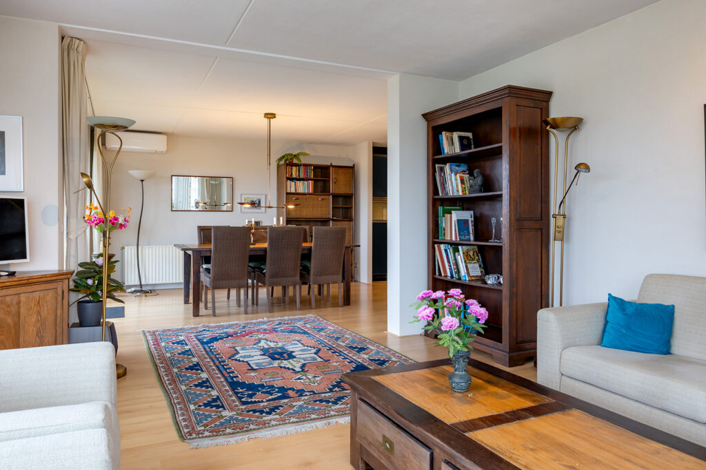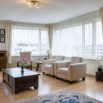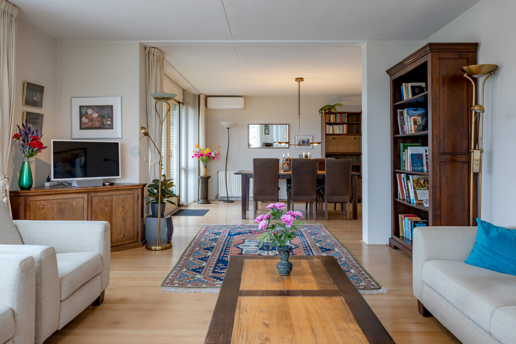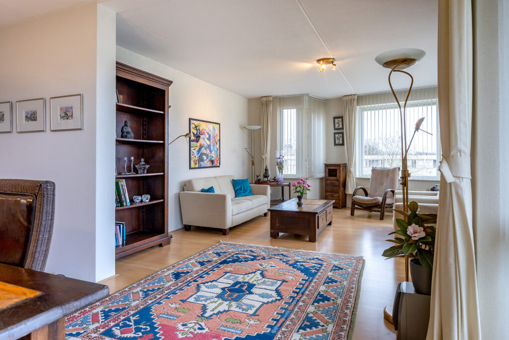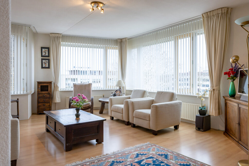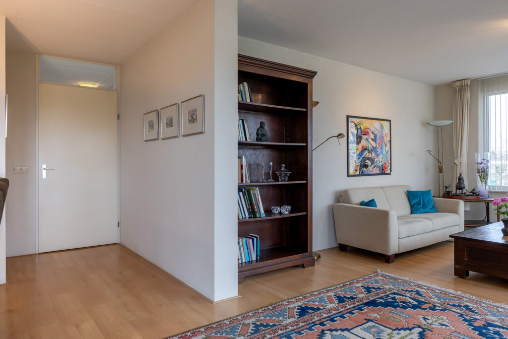 De woonkamer is riant en gelegen aan de voorzijde van het appartement met een prachtig vrij uitzicht. De wanden zijn voorzien van spachtelputz. Openslaande deuren geven toegang tot het balkon op het zuiden. Door de grote raampartijen aan de voor- en zijzijde is veel natuurlijke lichtinval aanwezig.