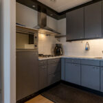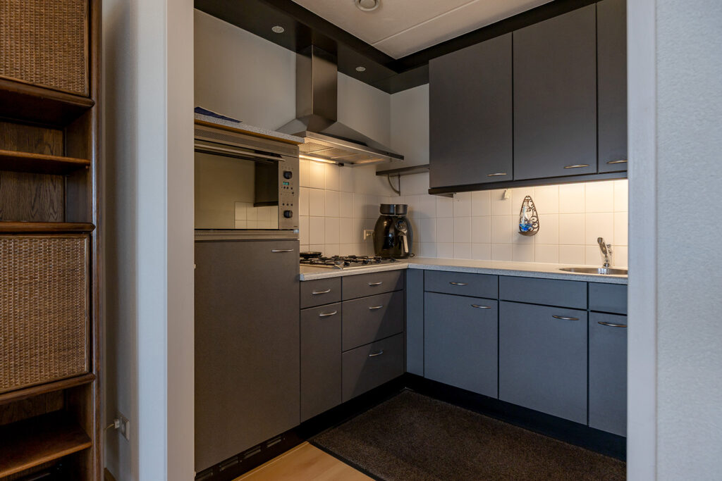 Half open eetkeuken met een L-vorm keukeninrichting met divers apparatuur zoals; een gaskookplaat met afzuigkap, vaatwasser, combi oven/magnetron en een koelkast (2025).