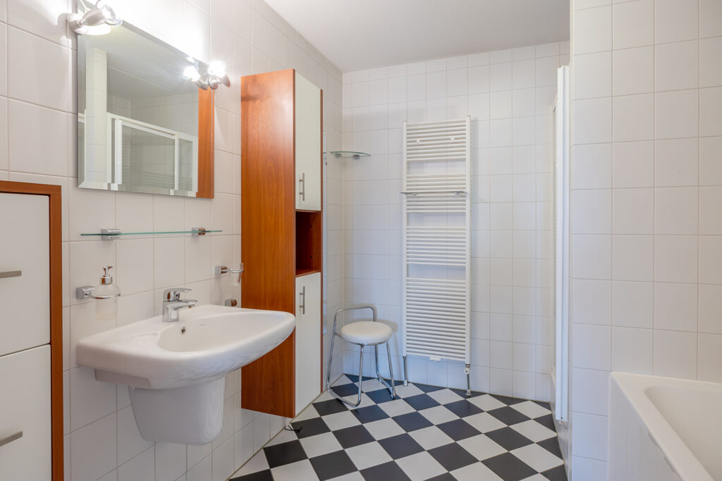 Volledig betegelde badkamer met een ligbad, douche, en wastafel met badmeubel met ruim voldoende opbergruimte. Lichte kleuren sanitair en tegelwerk.