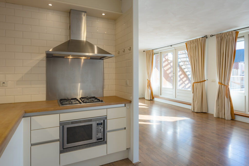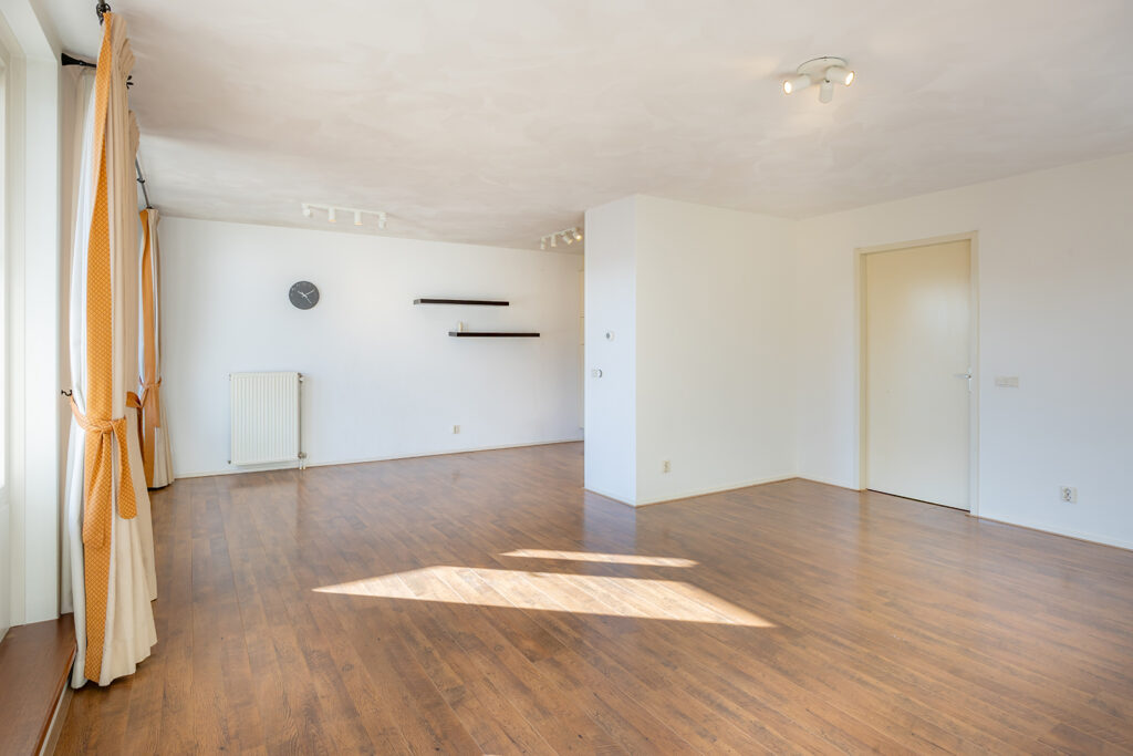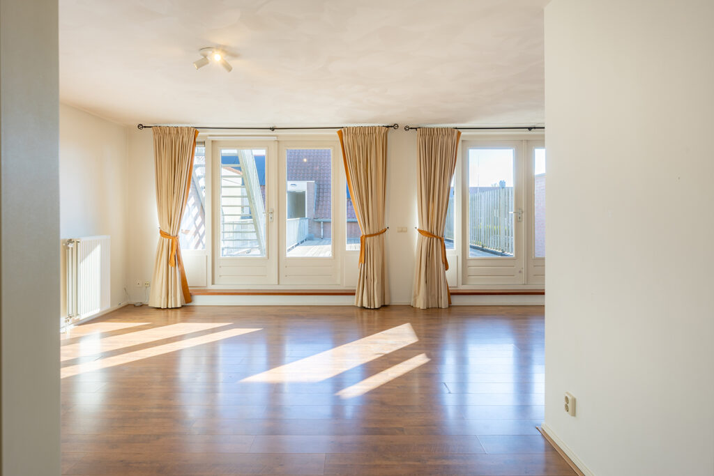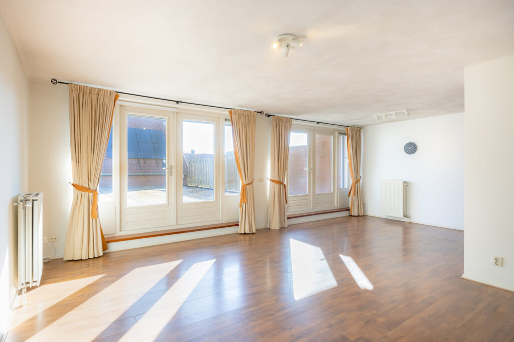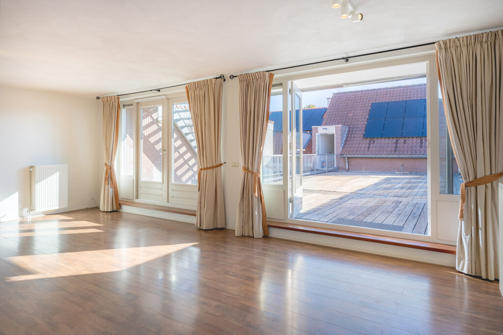 De woonkamer is ruim van opzet en gelegen aan de achterzijde van het appartement en voorzien van 2 dubbele openslaande tuindeuren welke toegang geven tot het riante unieke dakterras. De wanden zijn voorzien van spuitwerk en het plafond is voorzien van stucwerk. Door de grote raampartijen is veel natuurlijke lichtinval aanwezig.