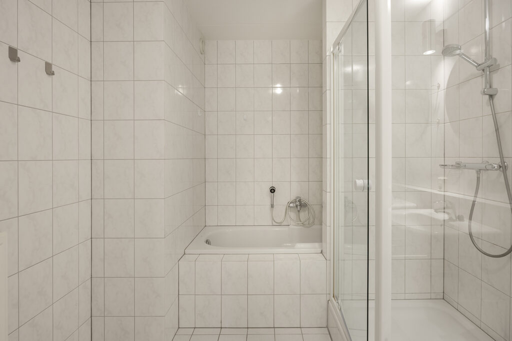 De volledig betegelde, zeer ruime badkamer is uitgevoerd met een ligbad, douchecabine en dubbele wastafel. Lichte kleuren sanitair en tegelwerk.