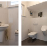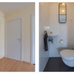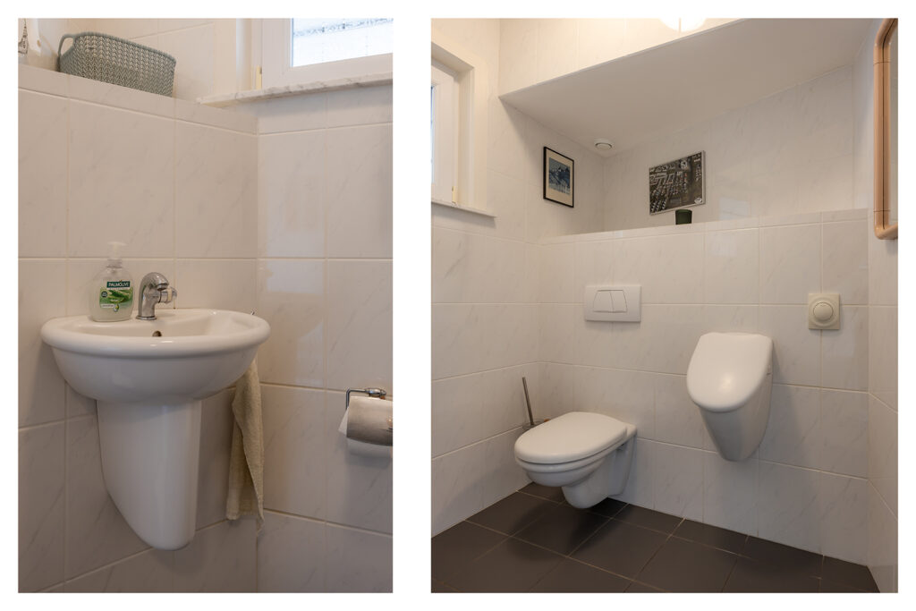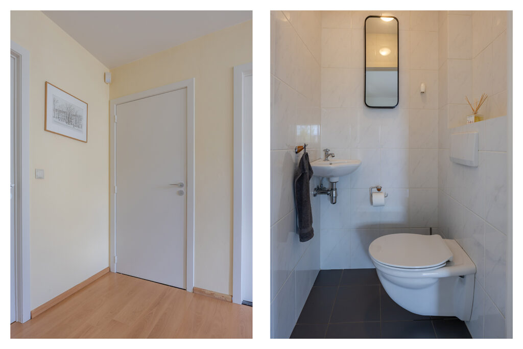 Via overloop toegankelijk; een separate, betegelde toiletruimte met inbouwcloset en fonteintje.