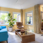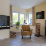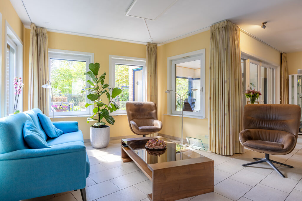 Via de hal is de speels ontworpen woonkamer bereikbaar welke is voorzien van een tegelvloer, een karakteristiek glas in lood raam en een Harry Leenders houtkachel. De wanden zijn voorzien van schuurwerk en plafonds voorzien van stucwerk. Aan de achterzijde van de woonkamer geven dubbele openslaande deuren toegang tot een tuinkamer. Deze tuinkamer is uitgevoerd met een houten vloer en afsluitbaar middels een glazen harmonica pui, welke volledig open kan. Een heerlijk binnen/buiten plekje voor het voorjaar en najaar, waar je kan genieten van de zon.
