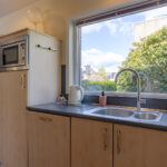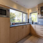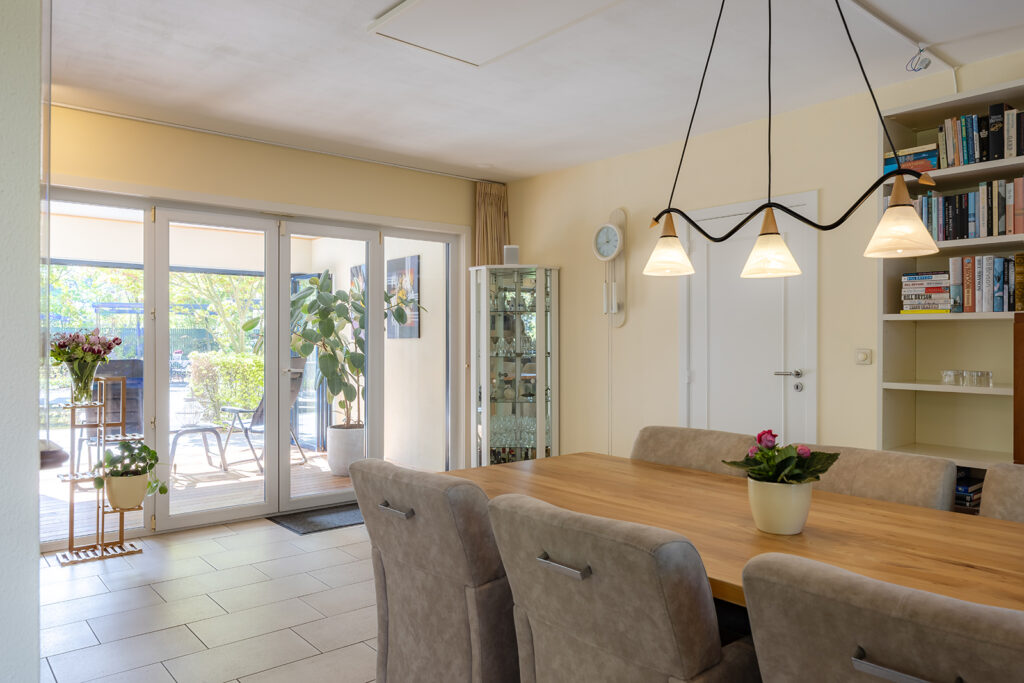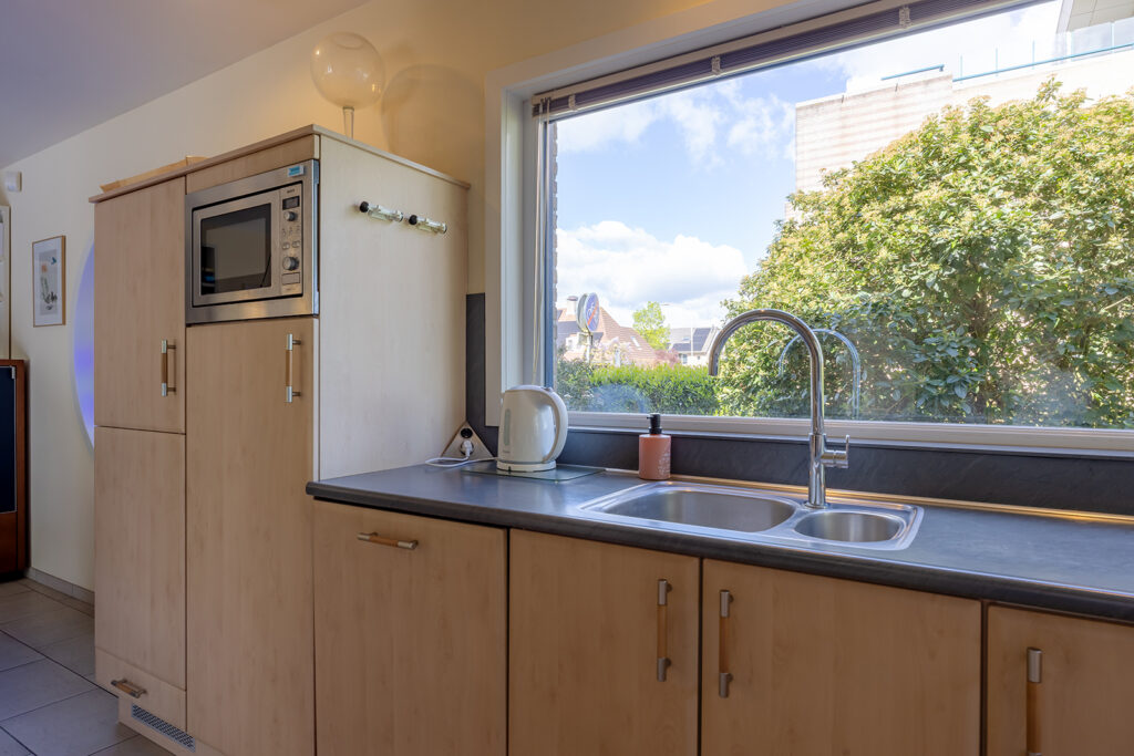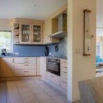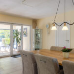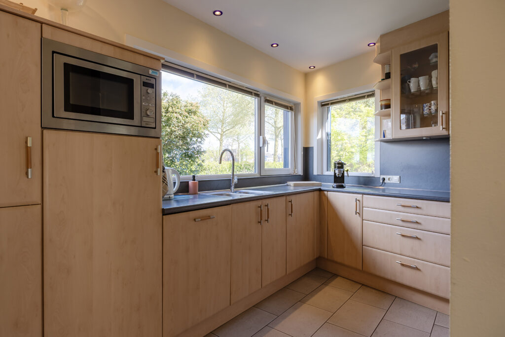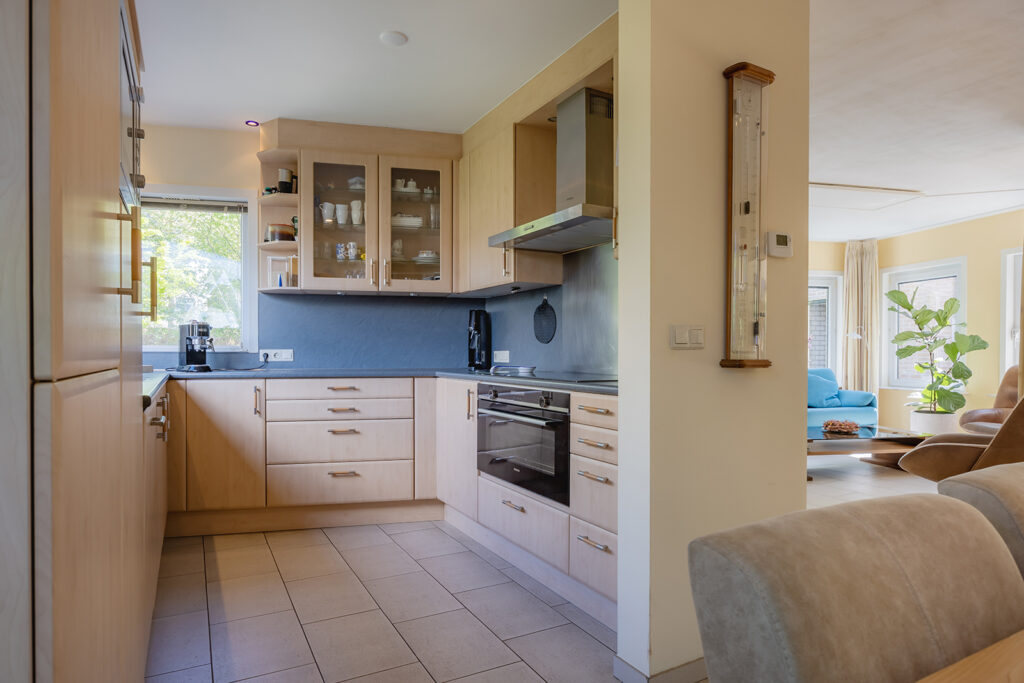De woon-/eetkeuken is gelegen aan de voorzijde van de woning en voorzien van een U-vorm keukeninrichting met een kunststof werkblad en achterwand en diverse apparatuur zoals: vaatwasser (2014), 90 cm brede oven (2020), magnetron , 90 cm brede inductiekookplaat (2022), afzuigkap (2018), koelkast en close-in-boiler van Daalderop van 10 liter.