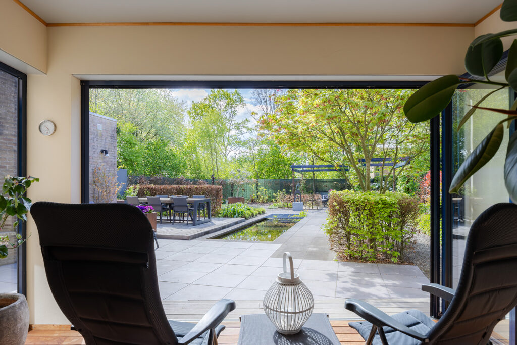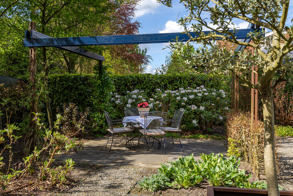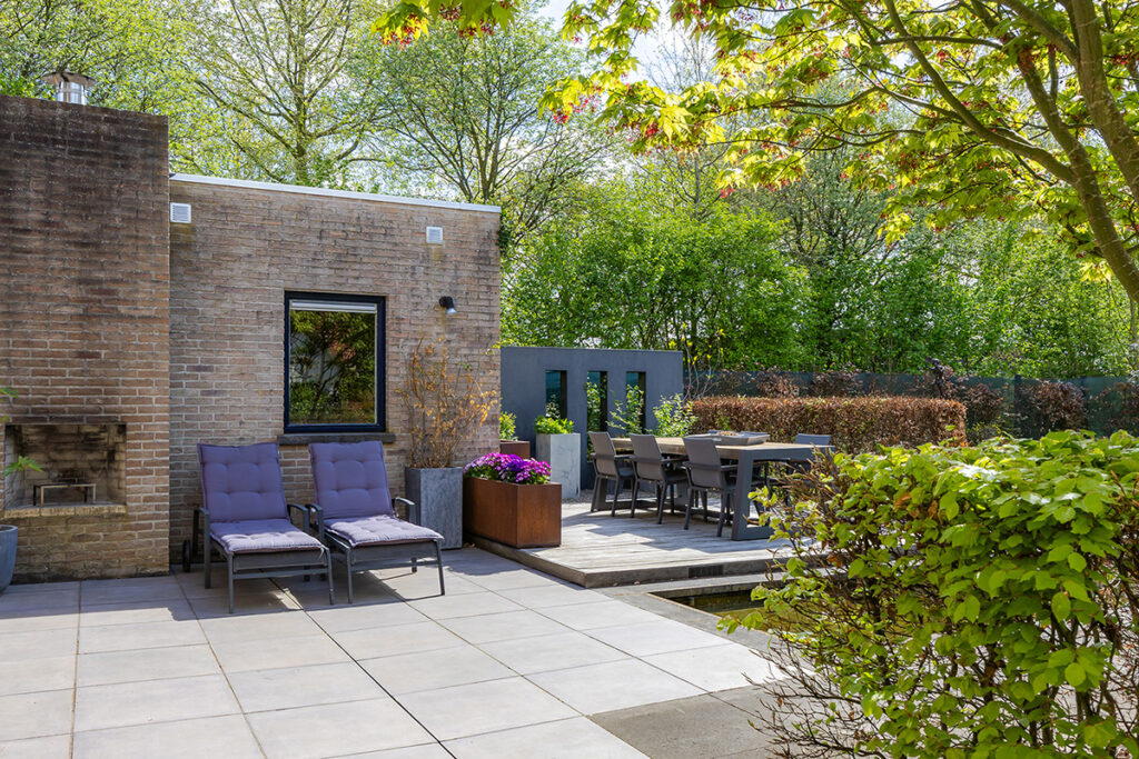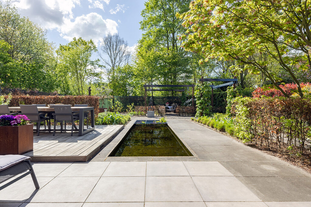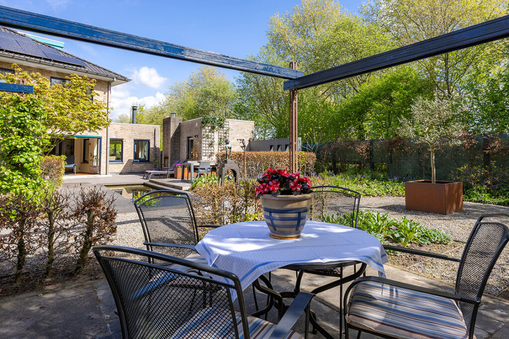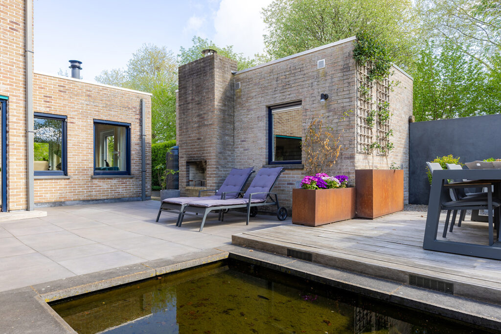 De royale tuin (2018) is onder architectuur aangelegd en ligt rondom de woning, waardoor je overal kunt genieten van rust en privacy. Het perceel is met veel zorg ingericht en biedt meerdere terrassen, een vijver en een pergola, waardoor er altijd wel een fijne plek is om buiten te zitten. Het fraai terras is betegeld met een luxe keramische terrastegel.