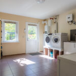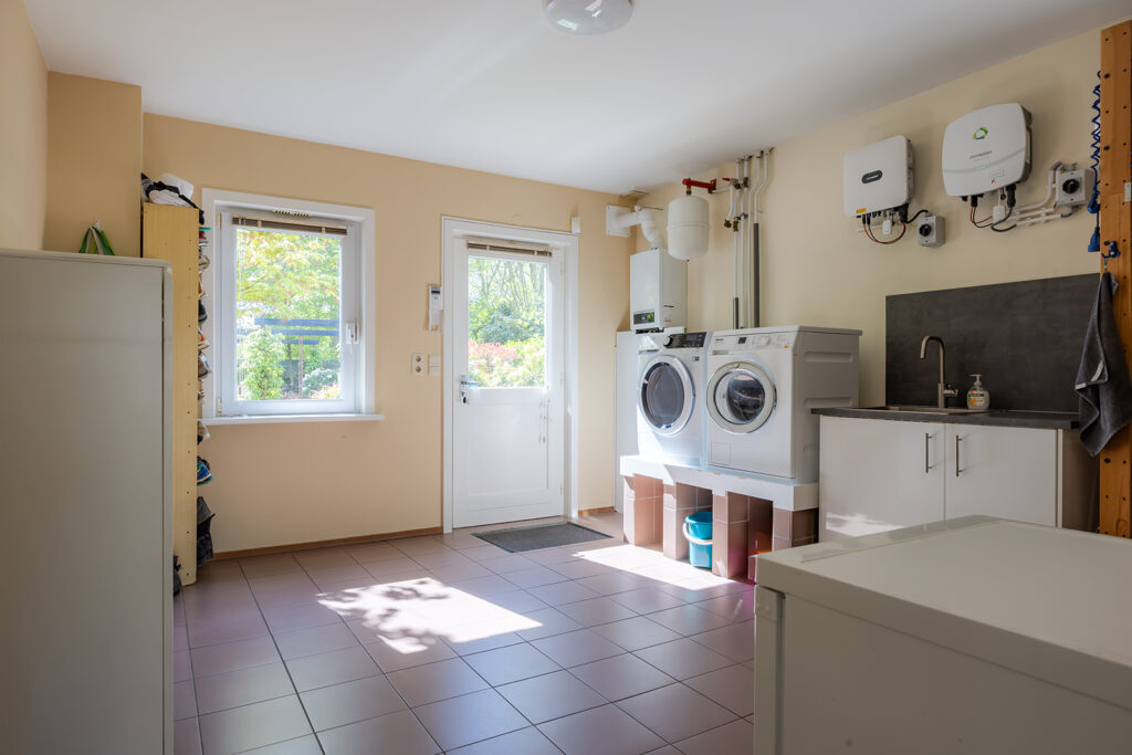 Via de hal is er eveneens toegang tot de praktisch betegelde ruime bijkeuken. De bijkeuken is voorzien van een wastafel met meubeltje met warm en koud water, opstelling CV-ketel (HR Nefit 2019) en de aansluitingen voor de wasmachine en droger (op hoogte gemetseld).