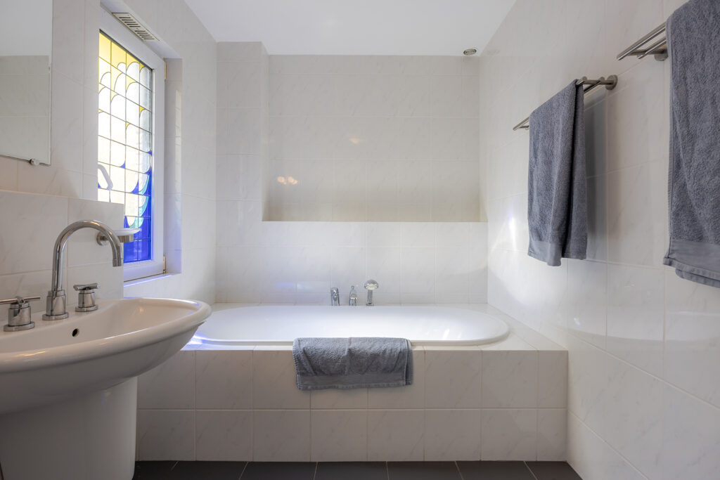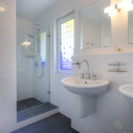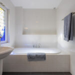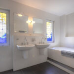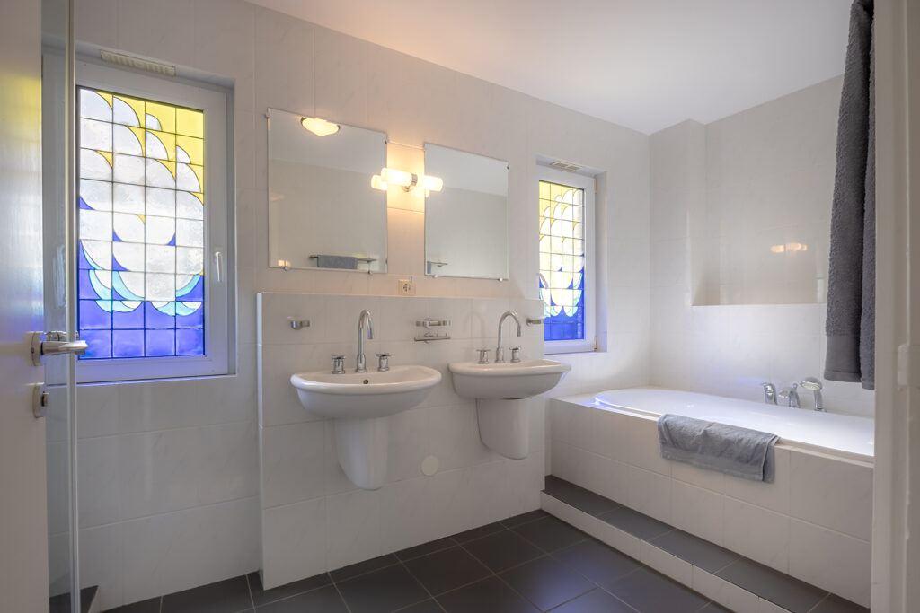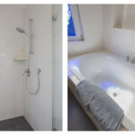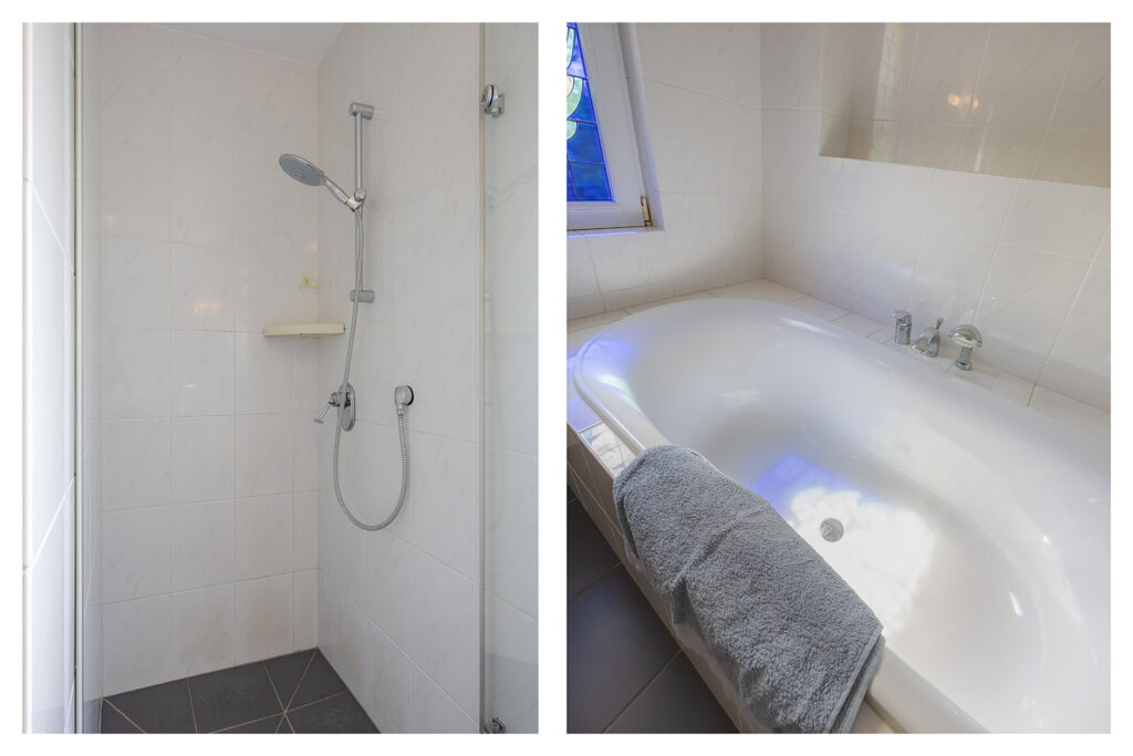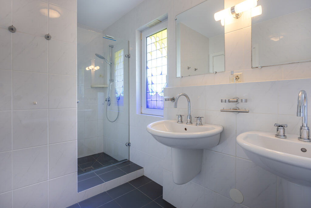 Volledig betegelde badkamer met een douche, ligbad en dubbele wastafel. De badkamer is tevens voorzien van vloerverwarming.