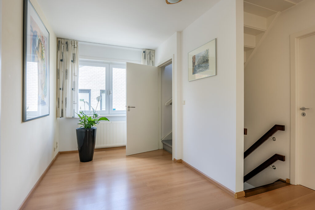 De hal is verder nog voorzien van een nette betegelde toiletruimte met inbouwcloset, separaat urinoir en fonteintje. Meterkast met 8 elektrische groepen.