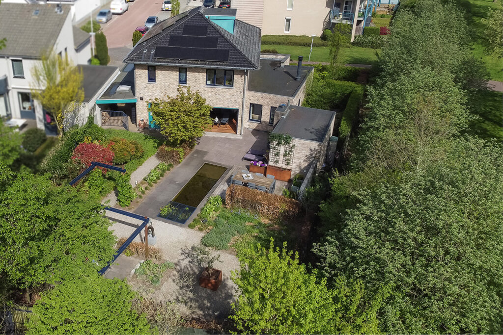Rondom de woning wordt gebruikt gemaakt van 4 regentonnen, die het regenwater opvangen en zijn aangesloten op een slagensysteem/druppelsysteem, welke door de gehele tuin is aangelegd.