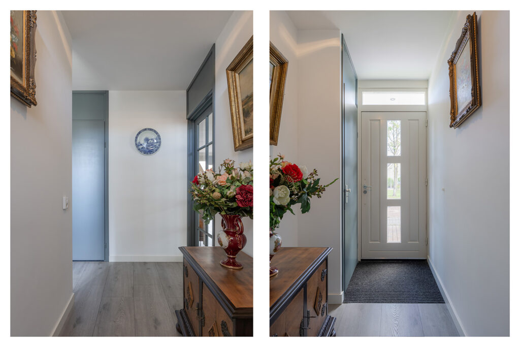 Entree; hal voorzien van een laminaatvloer met vloerverwarming (doorgelegd in de woonkamer), garderoberuimte en meterkast met 8 elektrische groepen.