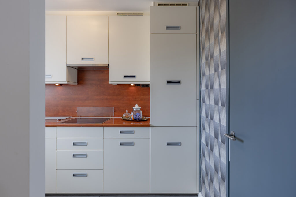 Links bevindt zich direct de keuken met een L-vorm keukenopstelling voorzien van een inductiekookplaat, afzuigkap, vaatwasser, koelkast en diepvries.