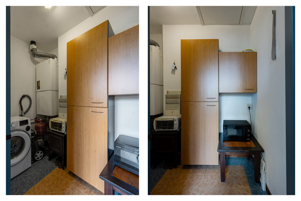 Vanuit de keuken is de betegelde inpandige berging bereikbaar met aansluitingen voor wasmachine en droger en opstelling combi-ketel (Nefit Ecomline HR 2002). De praktische berging is voorzien van een tegelvloer en is ca. 3 m2 groot. Via een vlizotrap in de berging is de bergzolder bereikbaar.