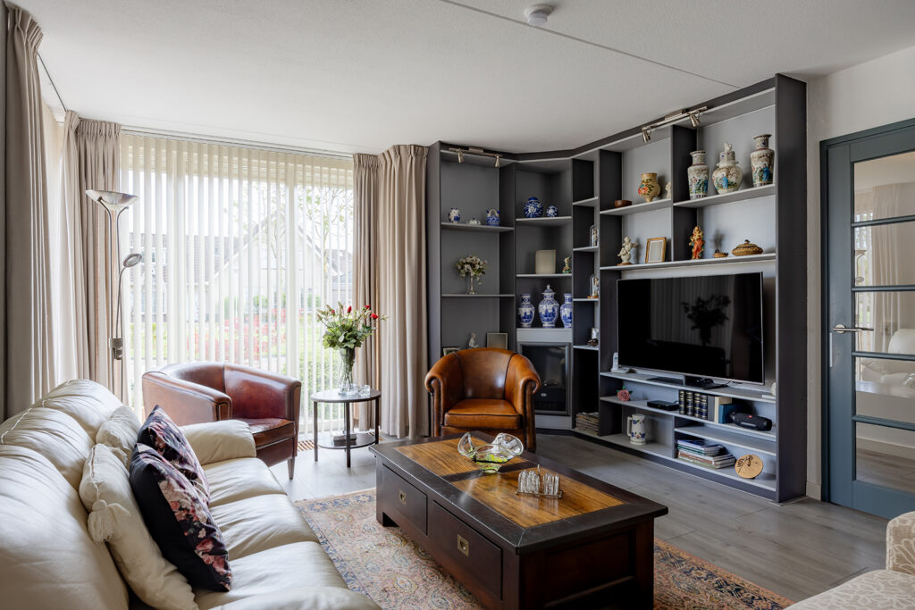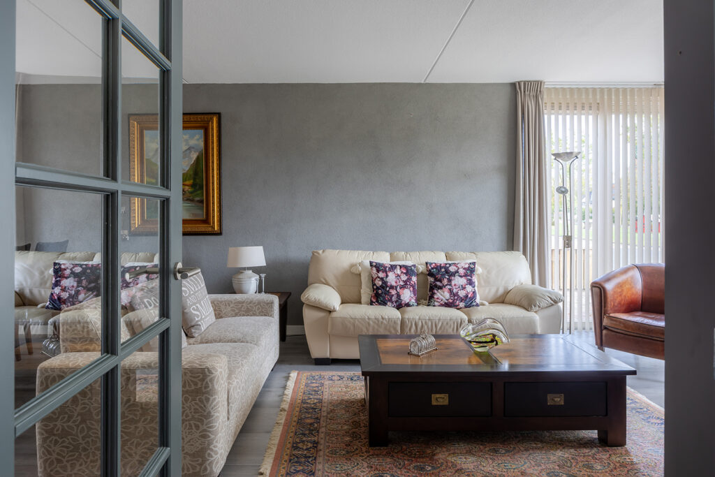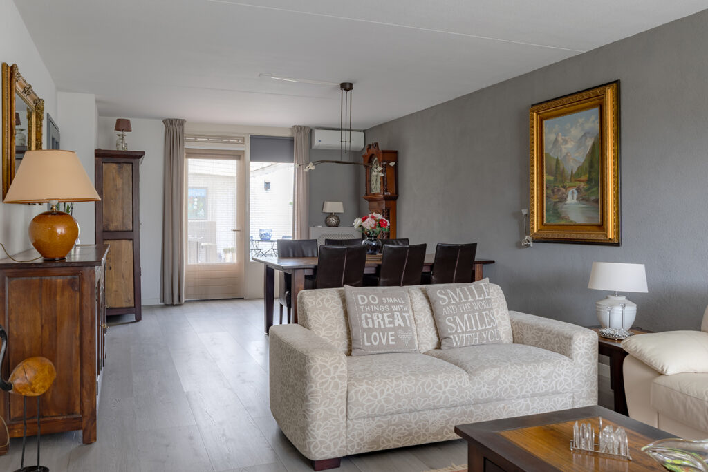 Via de hal en de keuken is de ruime woonkamer toegankelijk welke is voorzien van airconditioning. De wanden zijn voorzien van spachtelputz en het plafond van spuitwerk. De achtergevel is uitgevoerd met een grote pui met loopdeur die toegang geeft tot het mooie (deels overdekte) terras.